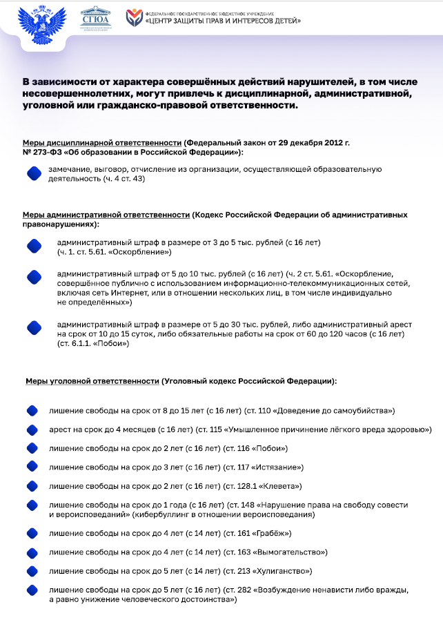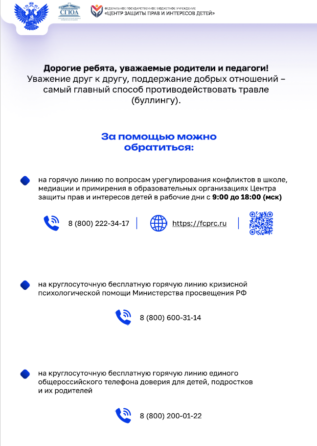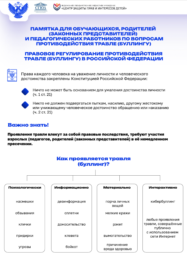 Представляем вашему вниманию памятку для обучающихся, родителей (законных представителей) и педагогических работников по вопросам противодействия травле (буллингу)