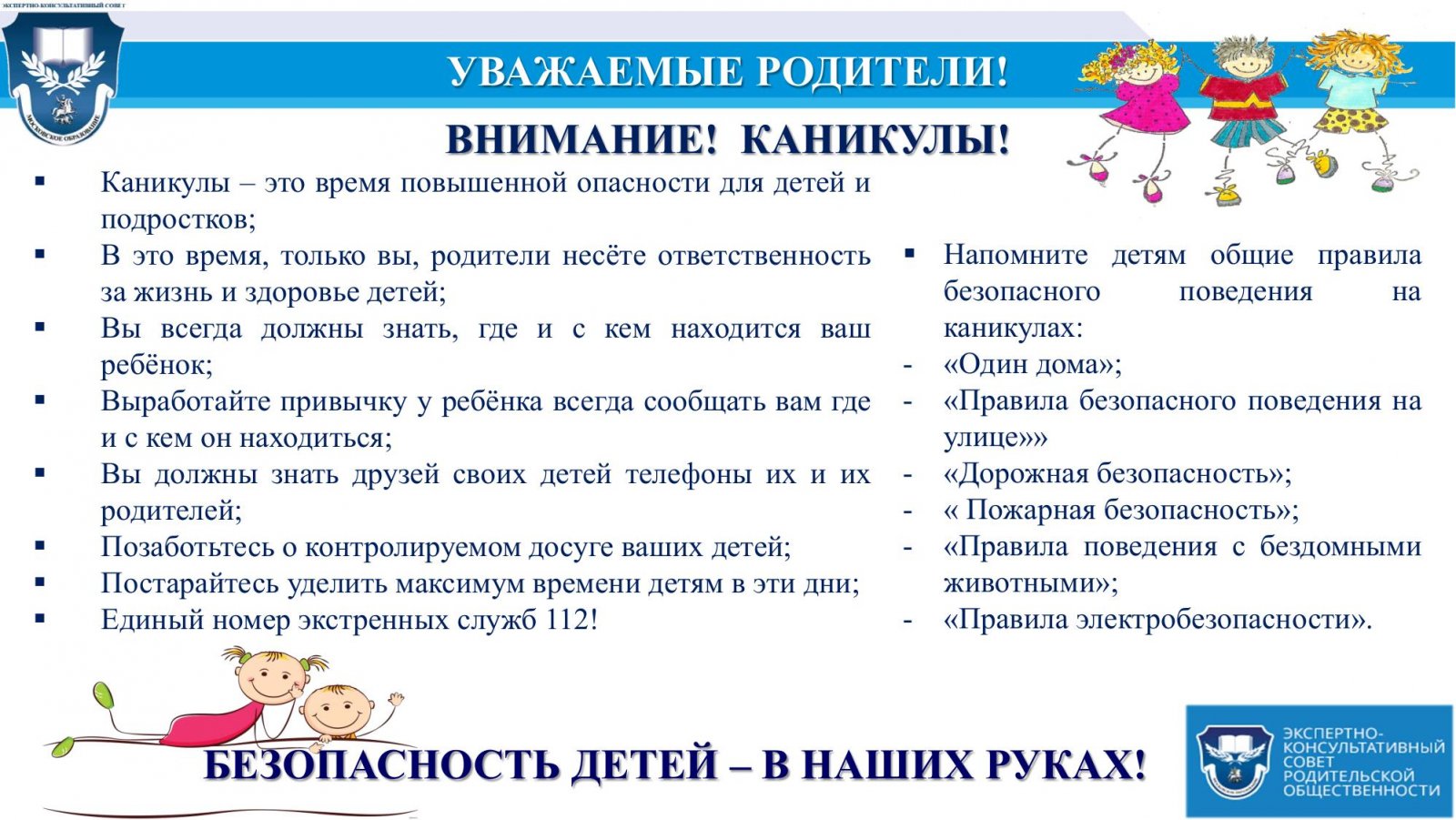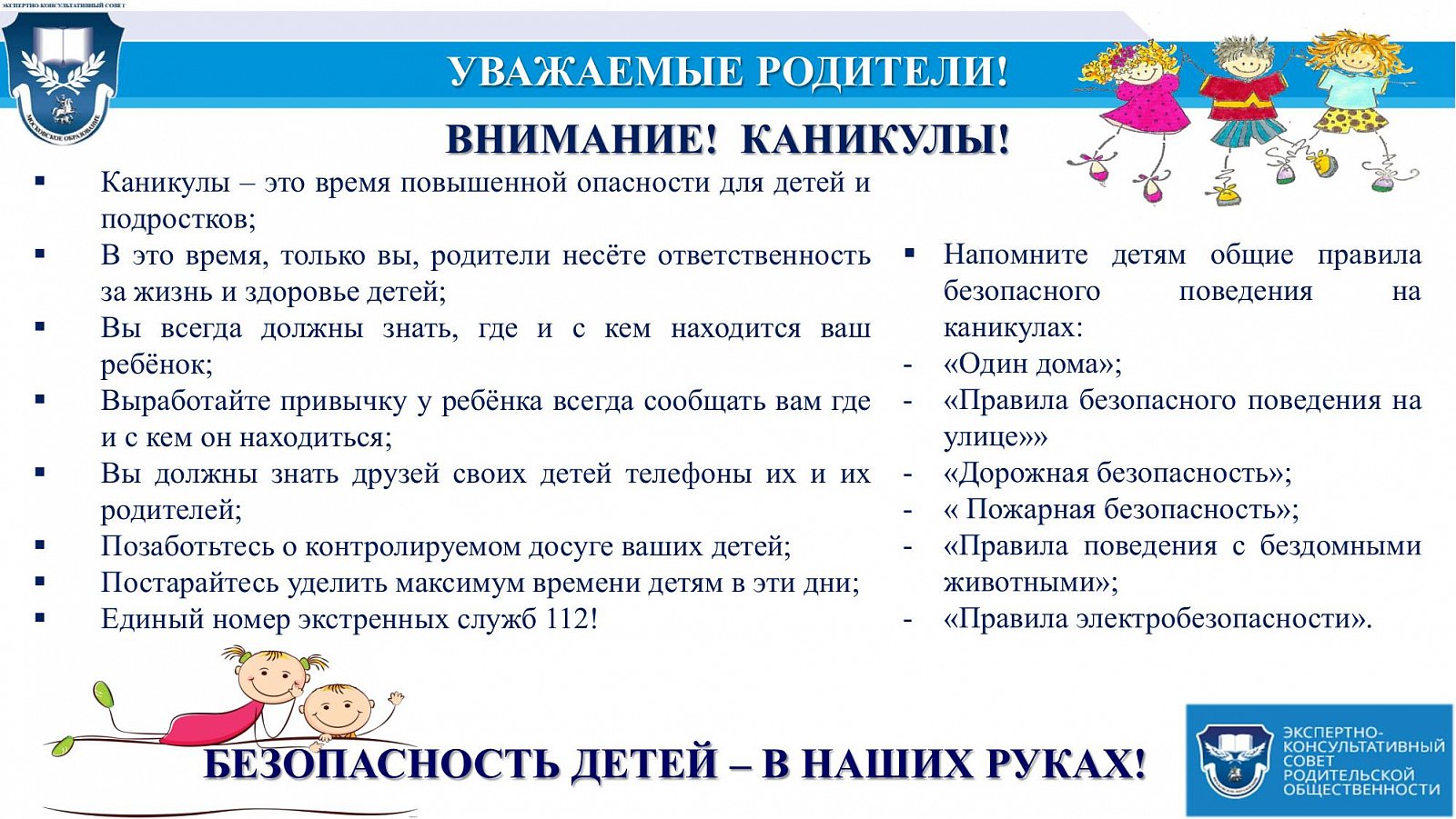 Важно помнить, что во время каникул ответственность за жизнь и здоровье детей несут родители.