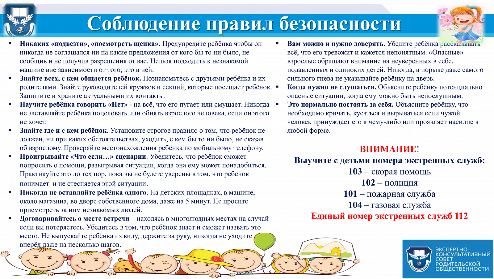 Также важно научить детей действиям при пожаре, показать возможные выходы для эвакуации. Необходимо выучить с детьми наизусть номера телефонов вызова экстренных служб: 101 — «Служба спасения», 102 — «Полиция», 103 — «Скорая медицинская служба», 112 — единая диспетчерская служба. 5