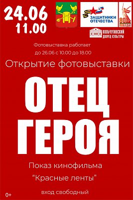 Уважаемые родители и воспитанники, приглашаем вас на открытие фотовыставки "Отец героя" и показ фильма "Красные ленты" 24 июня в 11.00 в Кольчугинский дворец культуры. Вход свободный