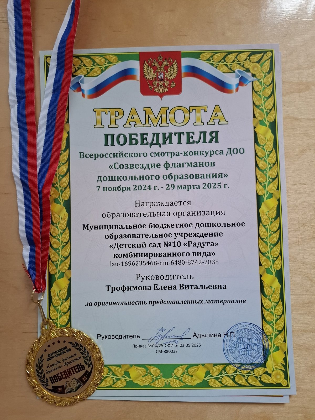 На протяжении 5 месяцев наш детский сад принимал участие во Всероссийском смотре-конкурсе ДОО "Созвездие флагманов дошкольного образования" в формате экспонирования электронного стенда. Стенд содержал описание работы и достижений нашего учреждения - многочисленные документы, планы, фото и видео материалы не оставили равнодушным жюри Федерального совета системы образования при ФРО и нам было присуждено удостоверение и грамота победителя за оригинальность и полноту представленных материалов.