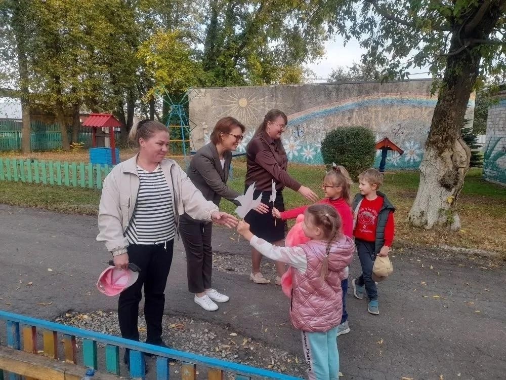 В рамках международного проекта " Единый час духовности " Голубь мира" наш МБДОУ " Детский сад 10"Радуга " принял активное участие в украшение окон здания МБДОУ белыми голубями с голубыми шарами. А так же, в изготовлении бумажного Голубя и раздаче белых символов духовности родителям воспитанников МБДОУ, как символ мира.